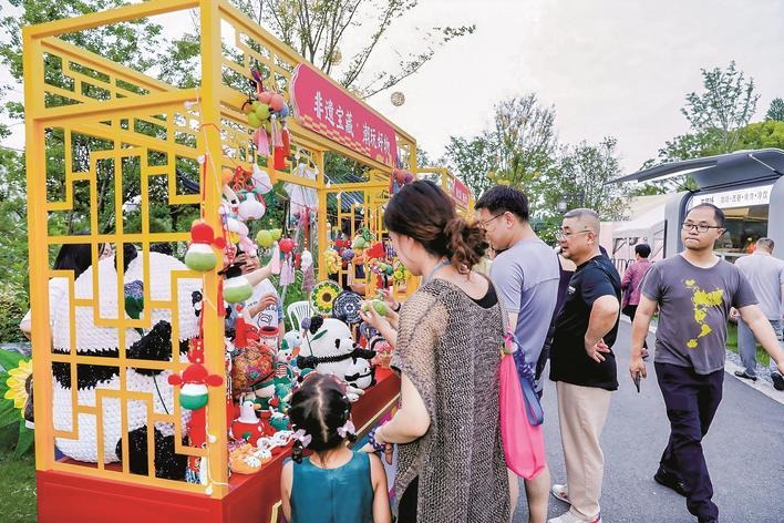 One spotlight event was a live demonstration of Guangling flower arrangement, a city-level ICH. Inheritor Yu Hong presented elegant floral designs using hydrangeas, peonies, and dahlias. Alongside this, other traditional crafts such as Hailing pyrography and Xinghua paper-cutting were also exhibited. Visitors also enjoyed trendy heritage items, such as miniature sculptures and tiger-head shoes, and sampled iconic local treats, including Huangqiao cold meat and Jiangyan crispy snacks.